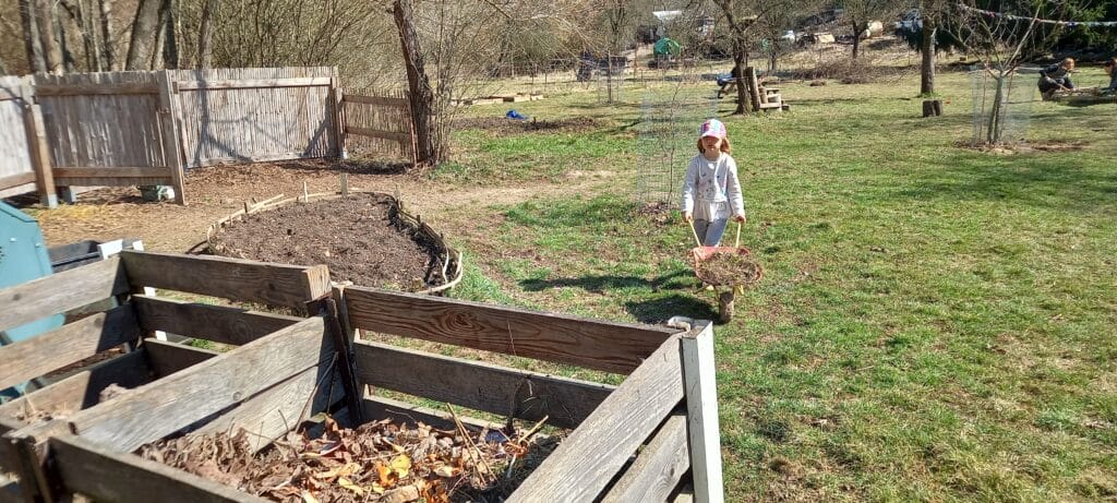 Kompostování a třídění biomateriálu je nedílnou součástí chodu celé školky, podílejí se na něm děti, průvodkyně i někteří rodiče.