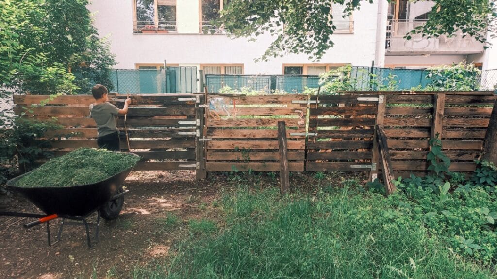 Školka má na své zahradě dva dřevěné kompostéry. První, malý kompostér se třemi oddíly po 1m³ tu založili v roce 2016. Slouží hlavně ke kompostování plevele, který vzniká při pěstování na záhonech tříd a záhonech zahradnického kroužku, biomateriálu ze školní kuchyně a toho, který vyprodukuje modrá třída. „Druhý, hodně velký kompostér (3 oddíly po 8,5m³) jsme založili na jaře 2023. Tento kompostér slouží především ke kompostování trávy, listí a dalšího bioodpadu, který vznikne při péči o zahradu,“ sděluje učitel. Oba kompostéry jsou vlastní výroby, vznikly ve spolupráci s rodiči při pravidelných společných brigádách.